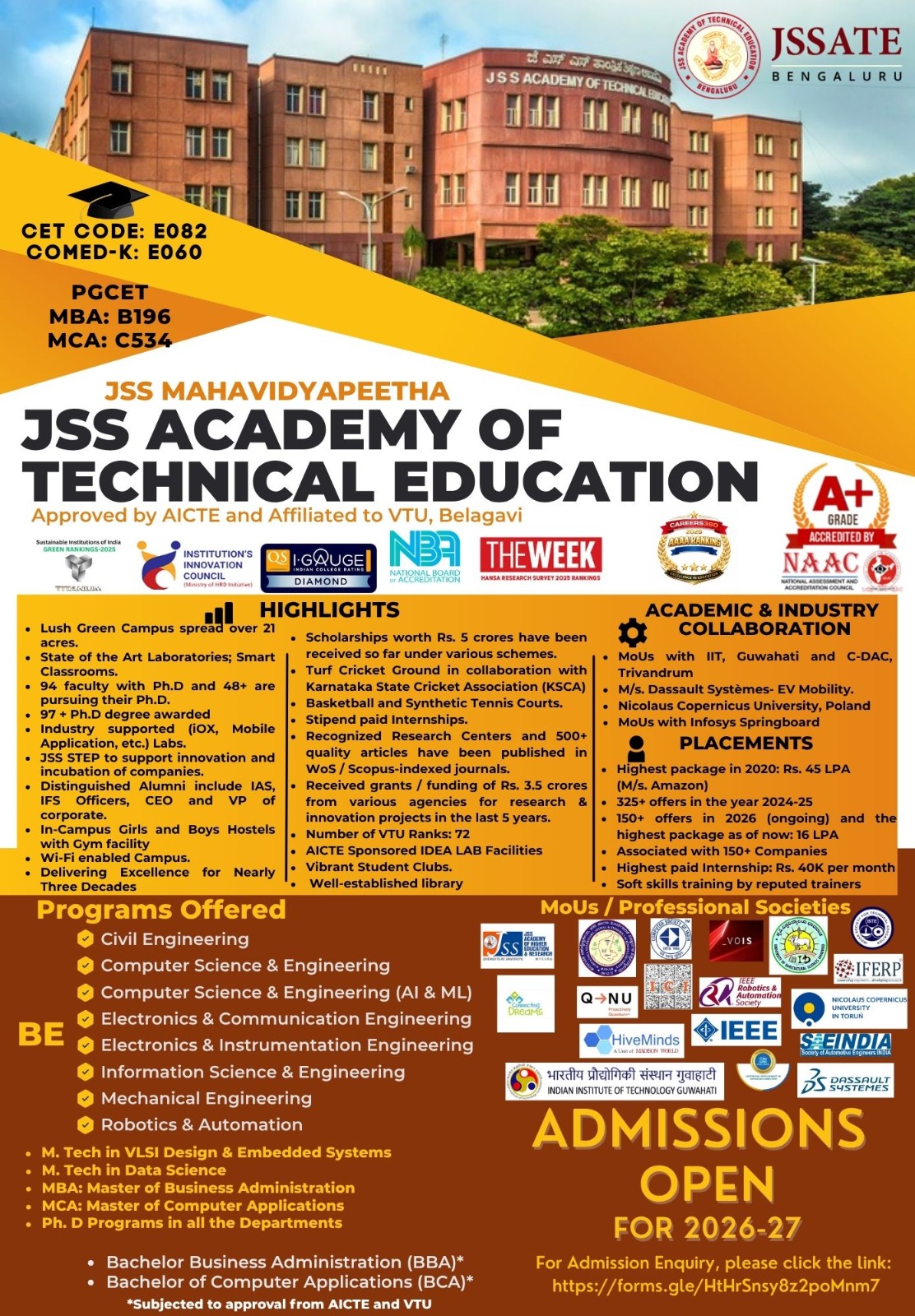 JSSATEB offers BE courses in 8 branches of engineering namely Civil, CSE, CSE(AI&ML),ECE, EIE, ISE,RA and Mechanical Engineering. Six disciplines are accredited from the National Board of Accreditation (NBA), New Delhi.
